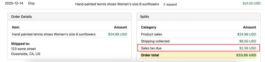 Etsy, on the other hand, includes sales tax in the total order amount. For example, if you click into your Etsy account from your Seller Ledger dashboard, and expand an order where sales tax was collected, you’ll see something like the following: